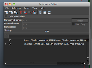 The next two images show the use of our referencing system in action. The first image is of the reference editor in maya, in this scene its referencing the ANIM scene for Shot0014 which in that file it contains references for the RIG/Character and finally the environment. As this is the Lighting scene I have referenced in the Intern Shaders which are now attached in the animated character.